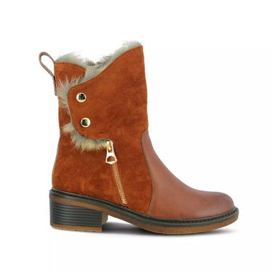 Stylish pull-on bootie featuring a foldable wild faux fur cuff with polished metal snap closures and an easy on/off lateral (outside) zipper all on...