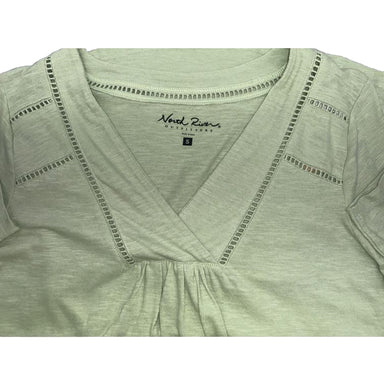View full detailsSoft, simple, and effortlessly stylish — the North River Laurel Green V-Neck Top is perfect for everyday wear. The delicate open-stitch trim and ga...